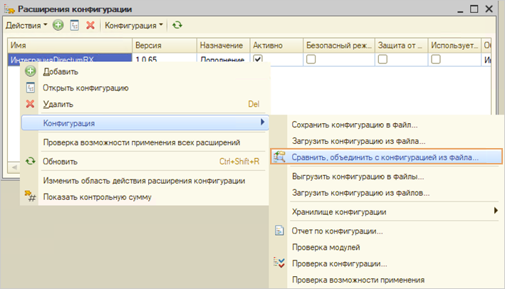 2.В контекстном меню расширения ИнтеграцияDirectumRX выберите пункт Конфигурация, затем выберите пункт Сравнить, объединить с конфигурацией из файла…: