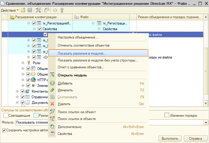4.Чтобы сравнить код измененных модулей, в контекстном меню доработанного модуля выберите пункт Показать различия в модулях: