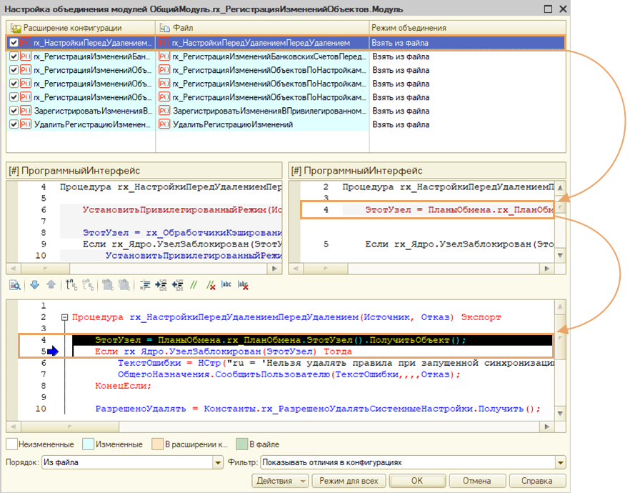 5.В открывшемся окне сравнения модулей выберите строку изменения и в столбце Режим объединения укажите режим Взять из файла: