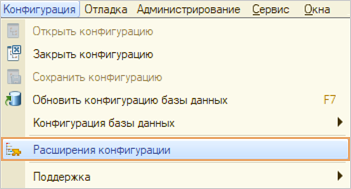 1.Откройте конфигуратор «1С: Бухгалтерия предприятия 3.0» и в главном меню выберите пункт Конфигурация/Расширения конфигурации: