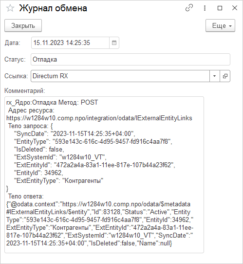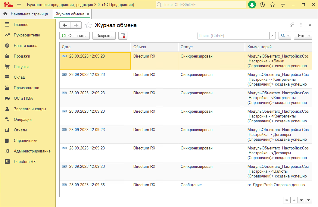 В журнале обмена хранятся события, которые возникают при синхронизации данных между Directum RX и 1С. С его помощью можно отследить статус синхронизируемой записи или ошибку при работе решения.