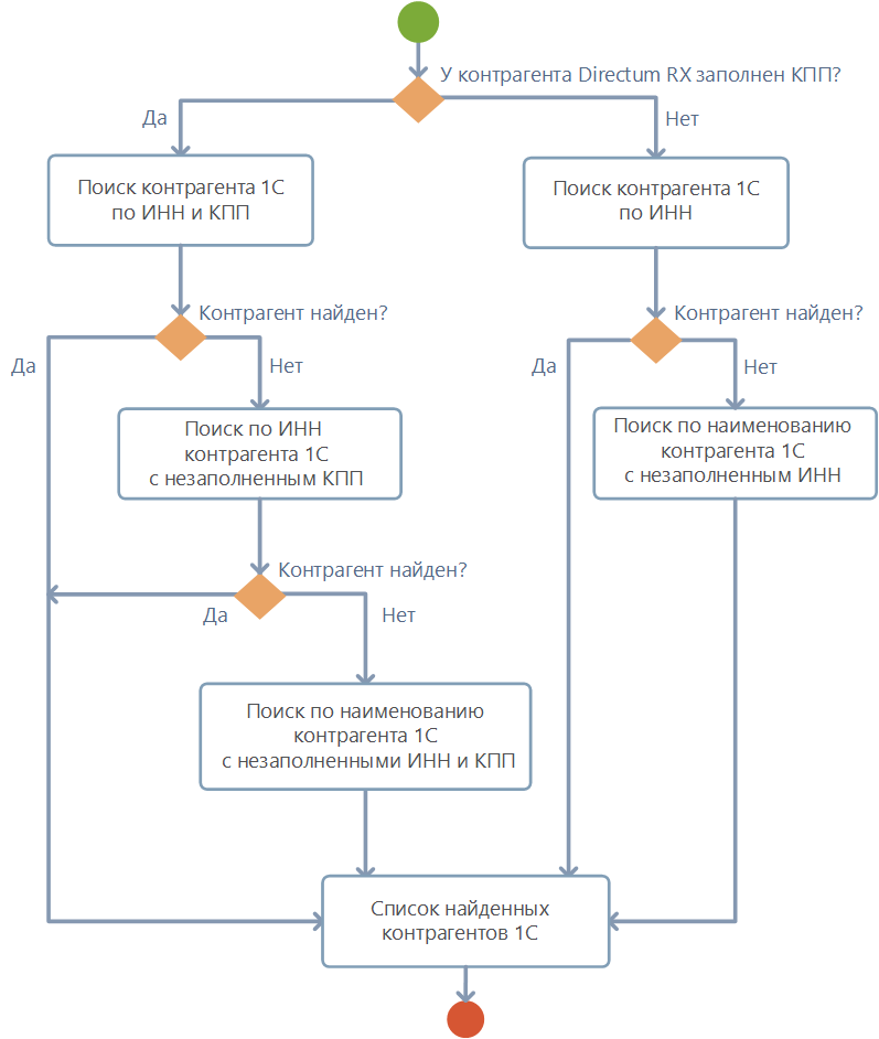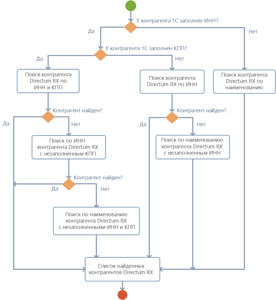 Если запись контрагента уже синхронизирована, то обновляются свойства связанной записи в Directum RX. Если запись не синхронизирована, то в Directum RX ищется соответствующая запись по ИНН, КПП и наименованию. При этом поиск выполняется по принципу: В результате: •если соответствующая запись не найдена, то в Directum RX создается запись, которая связывается с контрагентом в 1С; •если соответствующая запись найдена, то записи контрагентов из 1С и Directum RX связываются между собой; •если найдено несколько записей и из них только одна действующая, то она связывается с записью контрагента из 1С; •если найдено несколько записей и среди них несколько действующих или все закрытые, то такие записи считаются дублями. Запись контрагента из 1С не будет импортирована, пока в Directum RX есть дубли. В этом случае: •если есть несколько действующих дублирующих записей, то закройте все, кроме актуальной; •если все дублирующие записи закрыты, то сделайте действующей одну из них. |