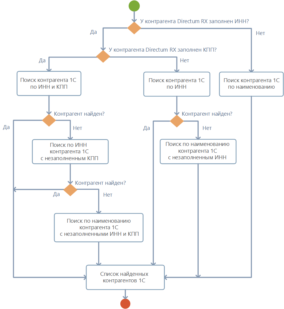 В результате: •если соответствующая запись не найдена, то в 1С создается новая запись, которая связывается с контрагентом в Directum RX; •если соответствующая запись найдена, то записи контрагентов из Directum RX и 1С связываются между собой; •если найдено несколько записей и из них только одна не помечена на удаление, то она связывается с записью контрагента из Directum RX; •если найдено несколько записей и среди них есть несколько не помеченных на удаление или все помечены на удаление, то такие записи считаются дублями. Запись контрагента из Directum RX не будет экспортирована, пока в 1С есть дубли. В этом случае: •если есть несколько не помеченных на удаление дублирующих записей, то пометьте на удаление все, кроме актуальной. Подробнее см. в разделе «Устранение неисправностей»; •если все дублирующие записи помечены на удаление, то снимите пометку с одной из них. |
