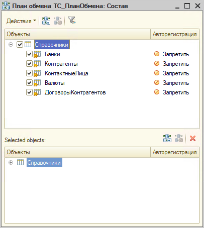 10.В свойствах плана обмена нажмите на кнопку Состав. В открывшемся окне выберите справочники, которые добавили, и в столбце Авторегистрация установите значение Запретить для всех объектов: