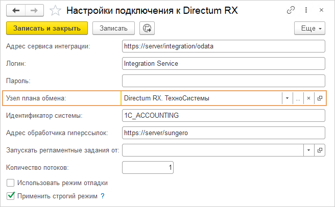 11.В программе «1С: Бухгалтерия Предприятия 3.0» откройте настройки подключения к сервису интеграции. В поле Узел плана обмена выберите созданный план обмена из выпадающего списка, создайте в нем новый узел, затем выберите его: