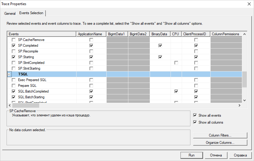 2.В окне «Trace Properties» установите флажки Show all events и Show all columns: