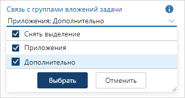 Чтобы настроить связь, в выпадающем списке выберите нужные группы вложений задачи и нажмите на кнопку Выбрать: