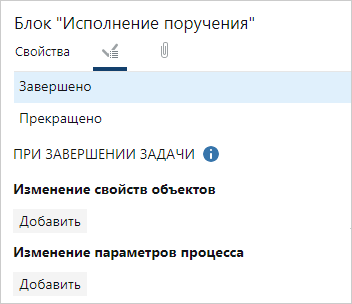 Для каждого результата завершения задачи можно указать параметры процесса и настроить изменение свойств объектов. При этом операции над параметрами выполняются, если у блока установлено свойство Ожидать завершения.