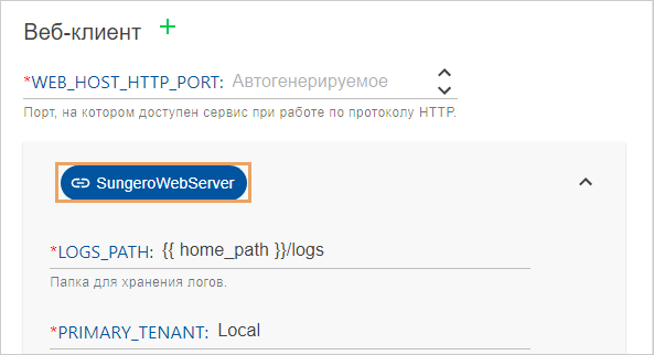 Некоторые параметры задаются в секции одного сервиса и автоматически применяются для другого. Например, часть параметров веб-клиента задаются в секции Веб-сервер. В этом случае в настройках веб-клиента отображается значок SungeroWebServer. Если изменить эти настройки, то они изменятся и в секции веб-сервера. Удалить их можно только в секции, в которой они заданы изначально. В приведенном примере эти параметры нужно удалить из секции Веб-сервер.