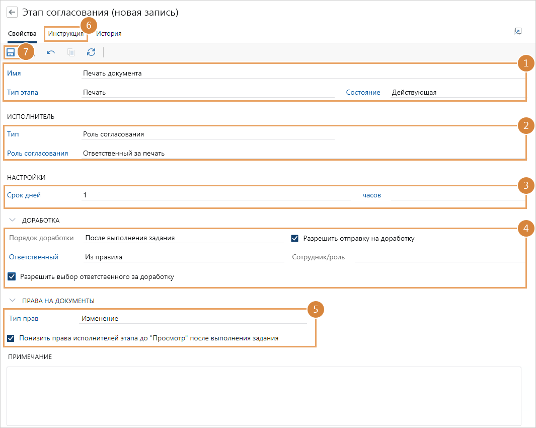1.В карточке этапа в выпадающем списке *Тип этапа выберите Печать и укажите имя этапа согласования.
