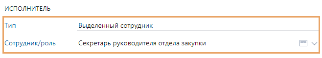 Чтобы исполнителем стал сотрудник определенной должности, укажите в качестве исполнителя роль с одним участником. Например, чтобы документ печатал сотрудник, который занимает должность «Секретарь руководителя отдела закупки». Для этого в поле *Тип выберите значение Выделенный сотрудник. Станет доступно поле *Сотрудник/роль. Укажите в нем необходимую роль. А чтобы исполнителем стал конкретный сотрудник, укажите в поле его имя.