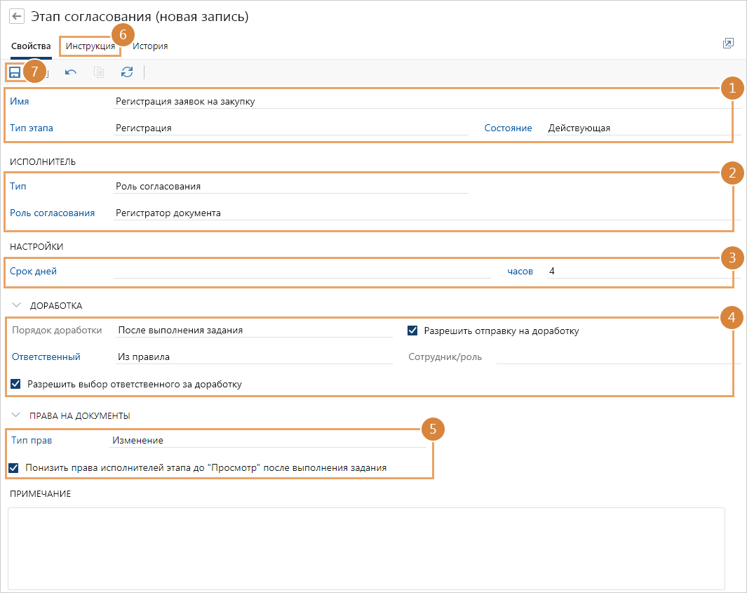 1.В карточке этапа в выпадающем списке *Тип этапа выберите Регистрация и укажите имя этапа согласования.