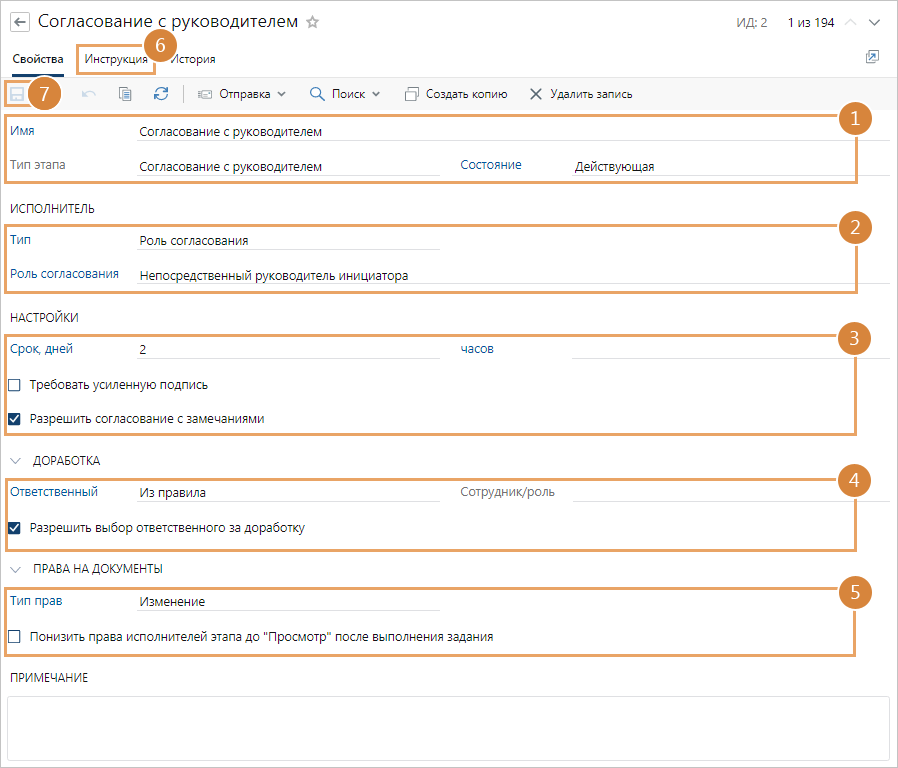 Примечание. Если задачу на согласование отправляет руководитель, который указан в поле Сотрудник/роль или вычислен с помощью роли с одним участником, то этап пропускается. Задание на согласование с руководителем не формируется.