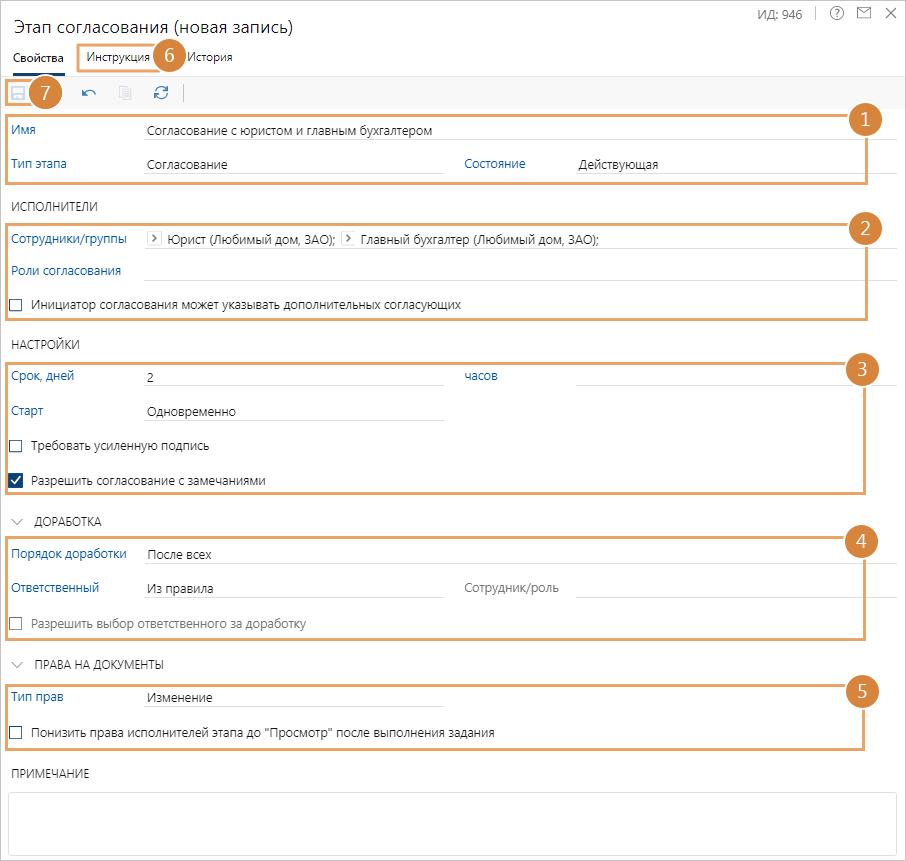 •Если нужно включить возможность выполнять задание с результатом «Согласовать с замечаниями», то установите флажок Разрешить согласование с замечаниями.