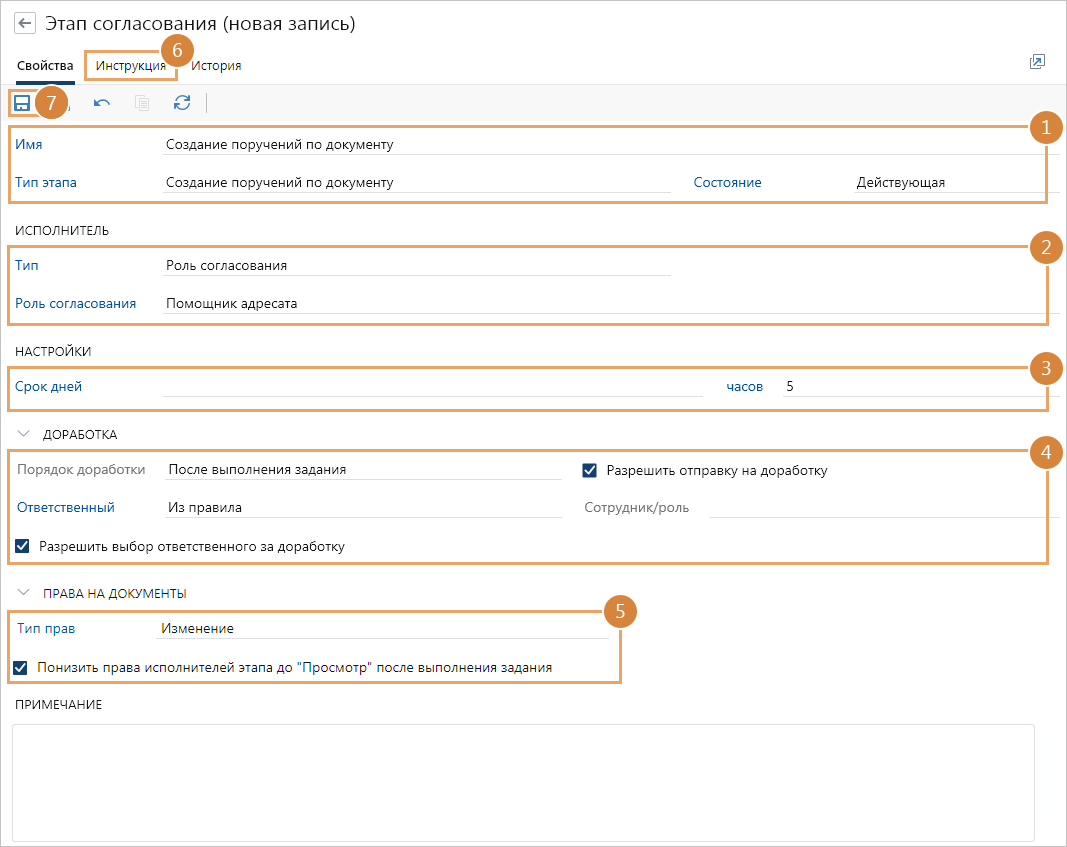 *Тип прав доступа, которые исполнитель получает на документ и его приложения в задании по этапу согласования. Возможные значения: Просмотр и Изменение.