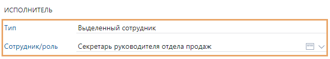 Чтобы исполнителем стал сотрудник определенной должности, укажите в качестве исполнителя роль с одним участником. Например, чтобы поручения создавал сотрудник, который занимает должность «Секретарь руководителя отдела продаж», в поле *Тип выберите значение Выделенный сотрудник. Станет доступно поле *Сотрудник/роль, укажите в нем необходимую роль. А чтобы исполнителем стал конкретный сотрудник, укажите в поле его имя.