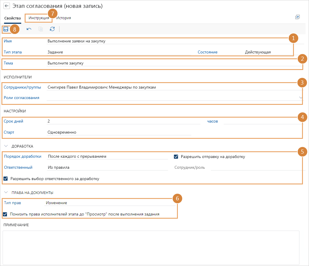 1.В карточке этапа в выпадающем списке *Тип этапа выберите Задание и укажите имя этапа согласования.