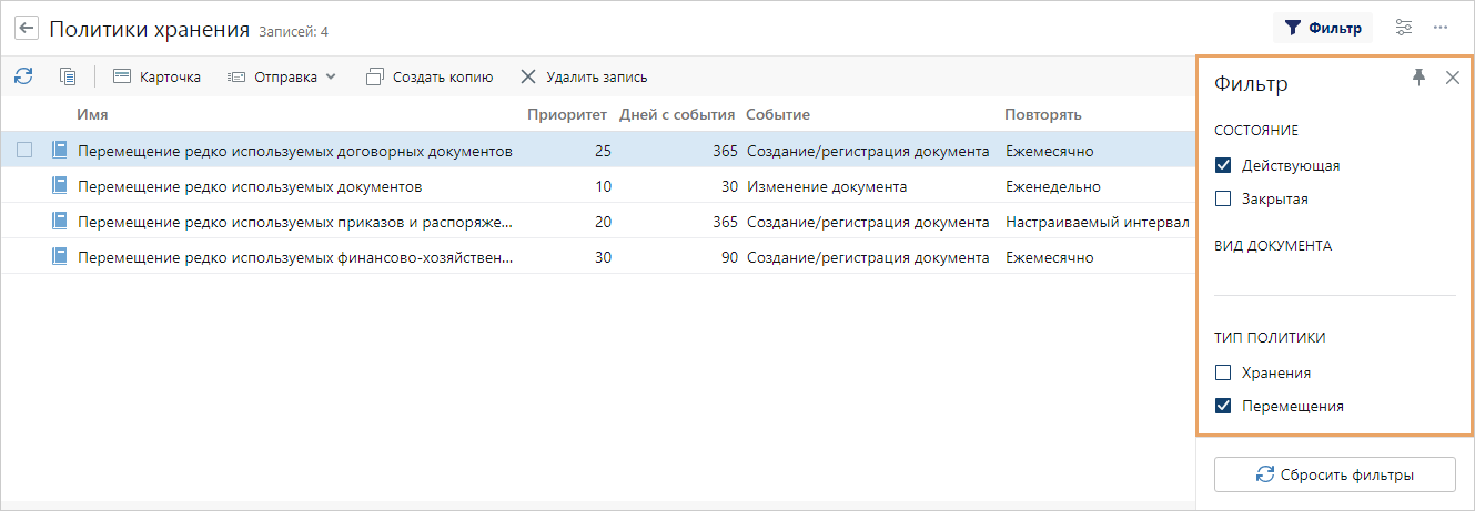Записи можно фильтровать по состоянию, по типу политик и по видам документов, для которых они настроены. Например, чтобы найти все действующие политики перемещения, в группе «Состояние» установите флажок Действующая, а в группе «Тип политики» – флажок Перемещения.