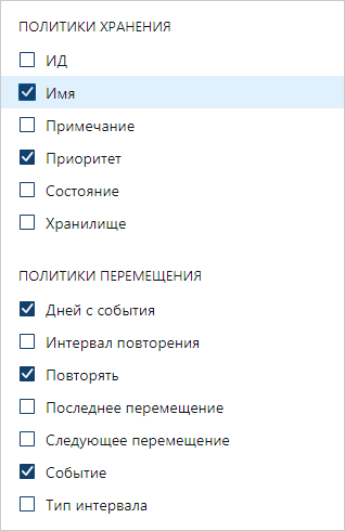 При добавлении новых политик в списке удобно сравнивать все текущие политики. Для этого на панели настройки внешнего вида включите отображение дополнительных колонок. Например, для политик перемещения можно включить отображение колонок: