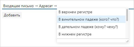При настройке вычисляемых выражений можно использовать функции – заранее определенные вычисления, которые обрабатывают значения свойств. Функции позволяют преобразовывать регистр символов и падеж, получать текущую дату и т.д. Список доступных функций зависит от предыдущего элемента вычисляемого выражения.