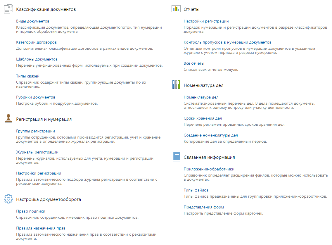 •типы связей, с помощью которых документы можно будет связывать между собой. Связанные документы группируются по типу связи в карточке документа на закладке «Связи»;
