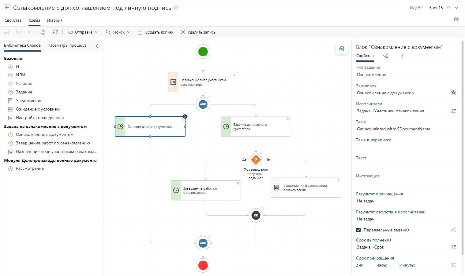 Пример настройки можно посмотреть в видеоролике «Введение в no-code. Настройка бизнес-процесса в Directum RX на примере» (6:18, YouTube).