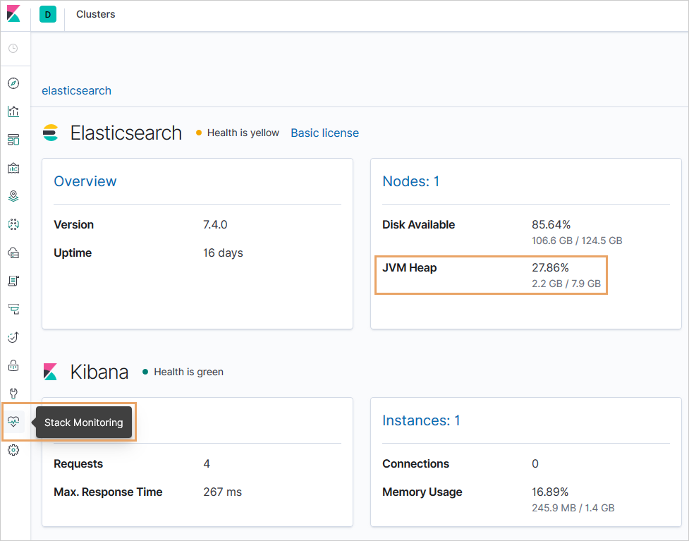 Чтобы посмотреть количество оперативной памяти, которое потребляет Elasticsearch, откройте панель управления Kibana, в меню выберите пункт Stack Monitoring и проверьте значение параметра JVM Heap:
