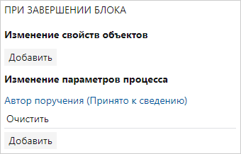 2.На вкладке «Свойства» в группе «При завершении блока» в поле Изменение параметров процесса нажмите на кнопку Добавить.