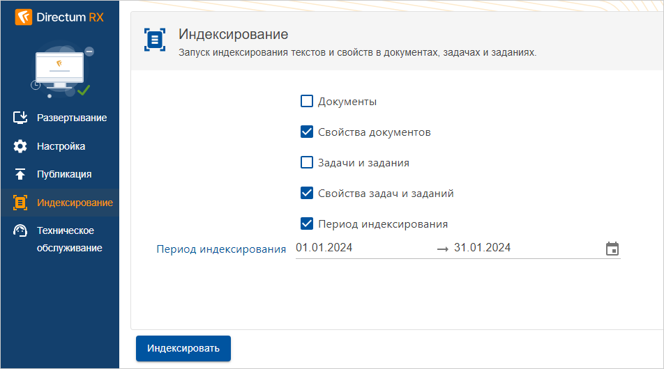 Первоначальное индексирование свойств можно выполнить на странице инструмента Directum Launcher или в командной строке.