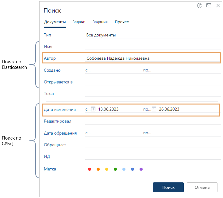 Например, если для поиска документа заполнены критерии Автор и Дата изменения, то сначала выполняется поиск в Elasticsearch по автору, затем в полученном списке записей выполняется поиск в СУБД по дате изменения: