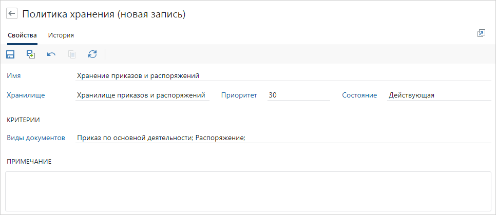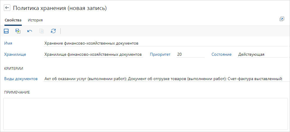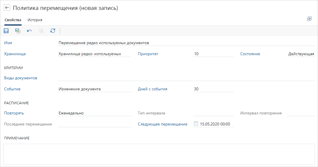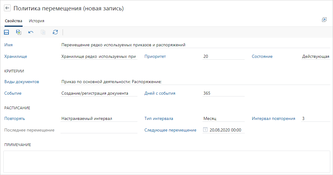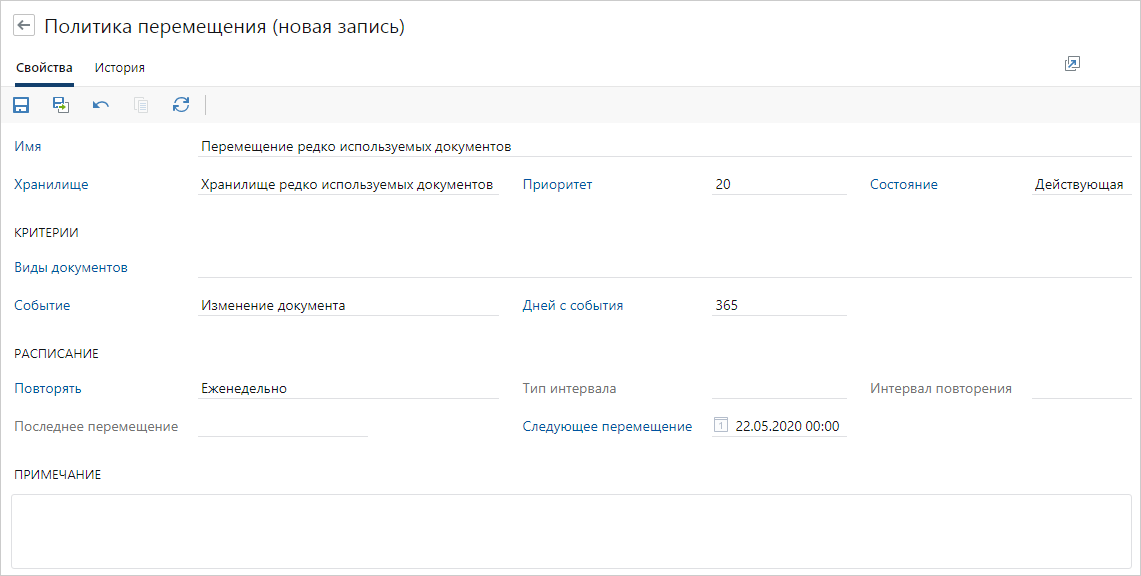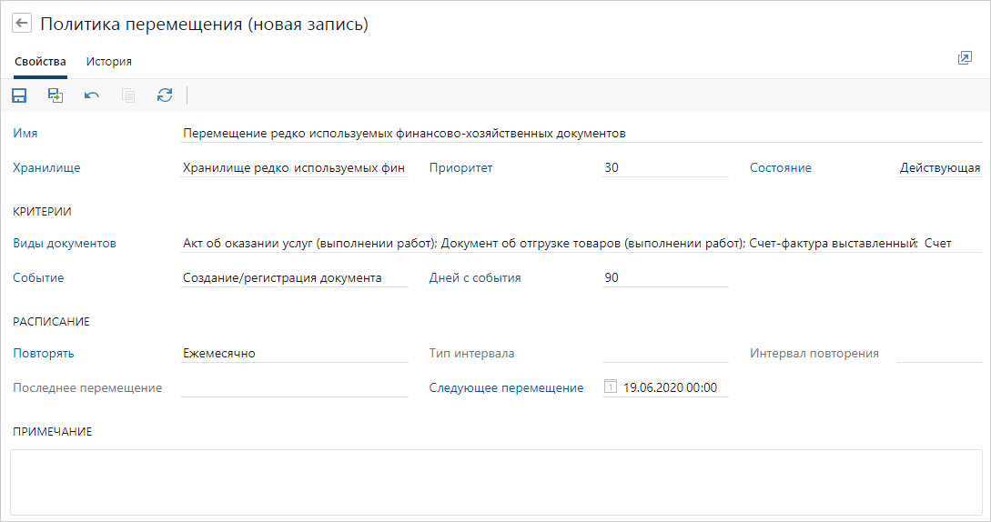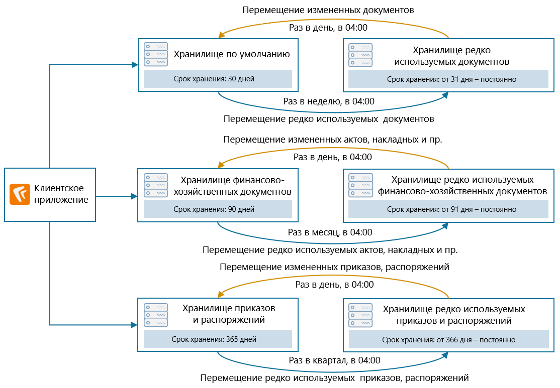 В крупных организациях могут храниться разные документы: финансово-хозяйственные, приказы, распоряжения и прочие. При этом объем документов и порядок работы с ними значительно отличается. В такой ситуации можно выделить несколько хранилищ для каждой группы документов: •Хранилище финансово-хозяйственных документов – для хранения первичных учетных документов, счетов-фактур с момента их оформления и до завершения работ по ним; •Хранилище редко используемых финансово-хозяйственных документов – для хранения первичных учетных документов, счетов-фактур, по которым завершились работы; •Хранилище приказов и распоряжений – для хранения организационно-распорядительных документов, например, приказов генерального директора, распоряжений руководителя, должностных инструкции; •Хранилище редко используемых приказов и распоряжений – для хранения организационно-распорядительных документов, оформленных год назад; •Хранилище по умолчанию – для хранения всех остальных документов, которые часто меняются, кроме финансово-хозяйственных, приказов и распоряжений; •Хранилище редко используемых документов – для хранения документов, которые не менялись, например, 1 месяц, кроме финансово-хозяйственных, приказов и распоряжений. ПРИМЕЧАНИЕ. В зависимости от цикла жизни документа определяется его срок хранения в хранилище, в которое он попадает изначально. Например, через 2-3 месяца с момента оформления товарных накладных по ним завершается работа. После этого срока можно переносить товарные накладные в хранилище редко используемых документов. Схема перемещения по хранилищам имеет вид: Для корректного размещения документов по хранилищам: 1.На каждом файловом сервере установите сервис хранилищ. Подробнее см. в разделе «Установка сервисов на выделенном сервере». 2.Создайте запись в справочнике Хранилища для каждого хранилища. В карточке записи хранилища, где размещаются все документы, кроме финансово-хозяйственных документов, приказов и распоряжений, установите флажок Хранилище по умолчанию, если он был снят. 3.Настройте политики хранения: •для финансово-хозяйственных документов: •для приказов и распоряжений: 4.Настройте политики перемещения: •в хранилище редко используемых финансово-хозяйственных документов: В результате с 19.06.2020 после 00:00 фоновый процесс перемещает все финансово-хозяйственные документы, которые созданы за 3 месяца до его запуска, в указанное хранилище. В дальнейшем перемещение выполняется раз в месяц; •в хранилище редко используемых приказов и распоряжений: В результате с 20.08.2020 после 00:00 фоновый процесс перемещает все приказы и распоряжения, которые созданы за 1 год до его запуска, в указанное хранилище. В дальнейшем перемещение выполняется раз в 3 месяца; •в хранилище остальных редко используемых документов: В результате с 15.05.2020 после 00.00 фоновый процесс перемещает все документы, которые не менялись последние 30 дней, кроме финансово-хозяйственных документов, приказов и распоряжений, в указанное хранилище. В дальнейшем перемещение выполняется раз в неделю; 5.При необходимости скорректируйте расписание запуска фонового процесса «Документооборот. Перемещение документов между хранилищами»: Если документы находились в хранилище редко используемых, и сотрудники изменили их, то ночью в заданное время фон