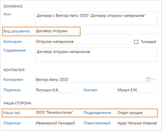 Данные в карточке документа |