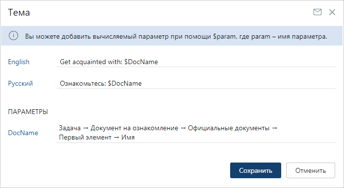 Для параметра рекомендуется задавать любое понятное название. В зависимости от решаемой задачи можно указать несколько параметров. Чтобы в теме заполнять имя автоматически, в шаблоне укажите параметр со знаком $, например $DocName.
