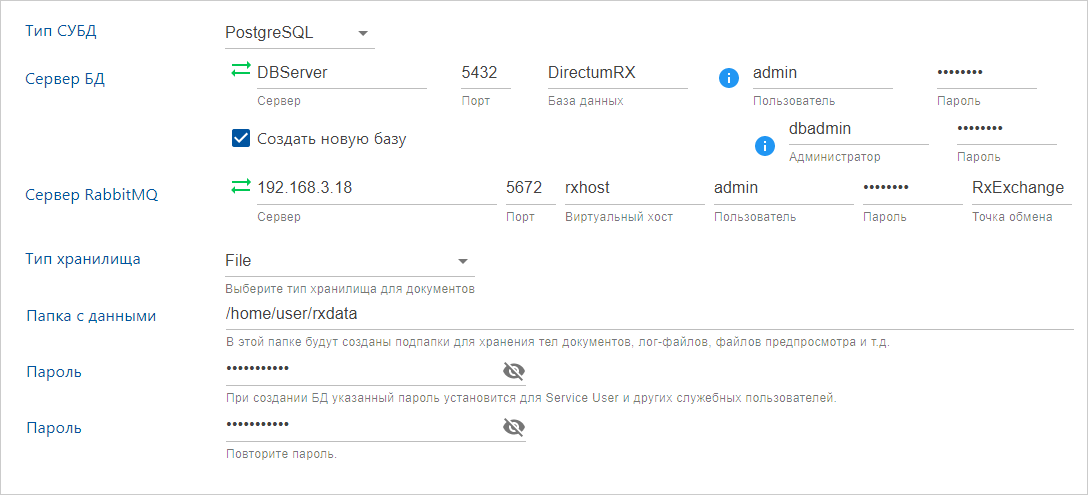 •Сервер. Имя экземпляра СУБД, на котором будет развернута база данных системы Directum RX;
