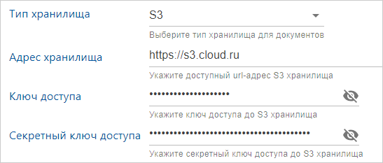 •S3 – объектное хранилище. Если выбрано это значение, то заполните поля Адрес хранилища, Ключ доступа и Секретный ключ доступа данными, которые получили от провайдера: