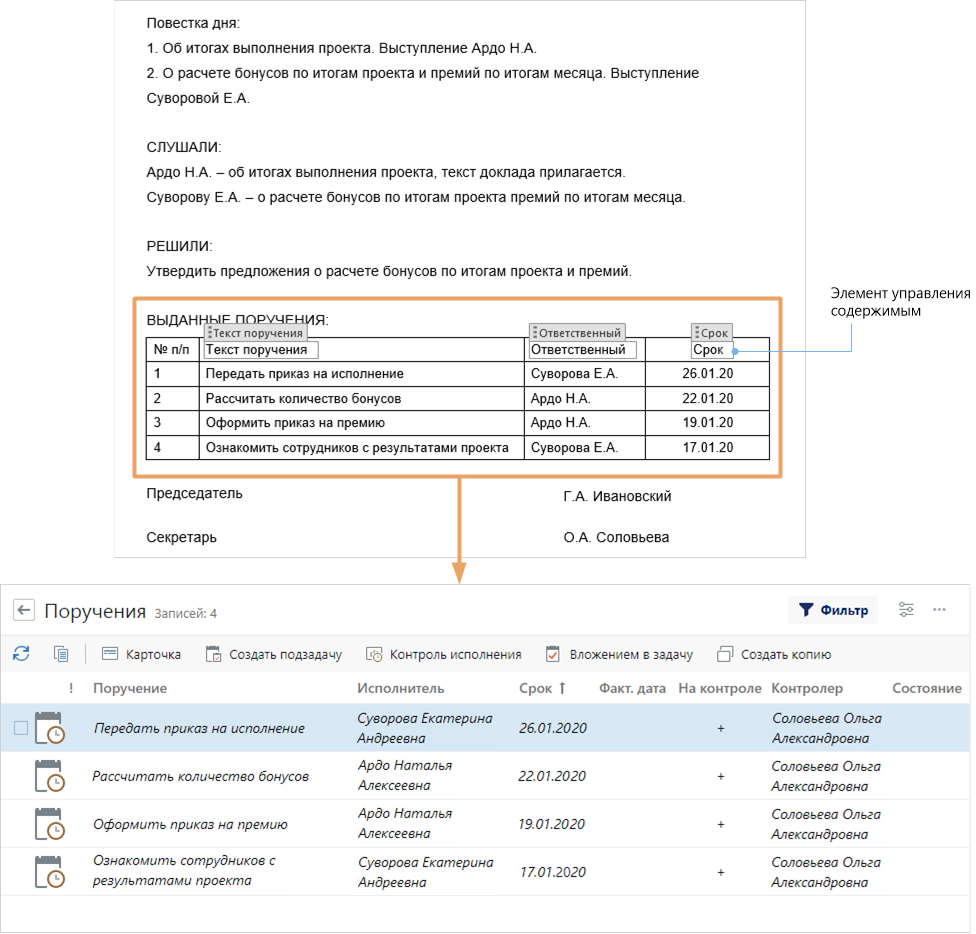 В системе есть стандартные шаблоны протоколов (полный и краткий), которые настроены для автоматизированного создания поручений. Рекомендуется использовать их для создания протоколов. В таких шаблонах уже настроена таблица «Выданные поручения» для указания решений совещания. В заголовках столбцов таблицы есть элементы управления содержимым. С их помощью система соотносит столбцы таблицы с полями в карточках поручений.