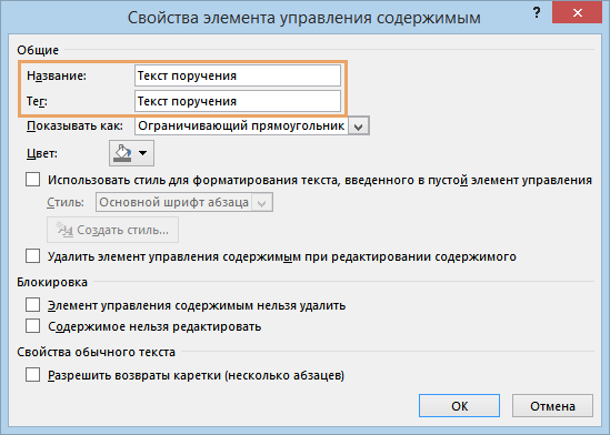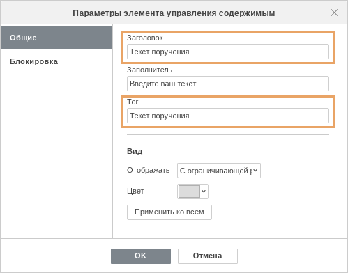 1.Настройте отображение вкладки Разработчик в Microsoft Word, если прежде не сделали это. 2.В содержимое шаблона добавьте таблицу. Для этого на ленте на вкладке Вставка в группе Таблицы в выпадающем списке Таблица выберите нужное количество столбцов и строк. Таблица должна содержать как минимум 3 столбца (для текста поручений, исполнителей и сроков). Количество строк может быть любым, при оформлении протокола секретарь совещания может добавить дополнительные строки. 3.В добавленной таблице укажите заголовки столбцов, которые увидят сотрудники при создании протокола из шаблона. Важно. Если сотрудники организации работают с документами в приложении LibreOffice, то данные для автоматизированного заполнения полей в карточках поручений определяются по названиям столбцов таблицы, а не по элементам управления содержимым. Поэтому в этом случае назовите соответствующие столбцы таблицы Текст поручения, Ответственный и Срок. 4.Добавьте для заголовков столбцов таблицы элементы управления содержимым Для этого выделите заголовок и на ленте на вкладке Разработчик в группе Элементы управления нажмите на кнопку 5.Задайте свойства элементов управления содержимым в заголовках столбцов. Для этого выделите элемент и на ленте на вкладке Разработчик в группе Элементы управления нажмите кнопку Свойства. В открывшемся окне укажите одинаковое значение в полях Название и Тег. Аналогично заполните свойства для каждого заголовка. Рекомендуемые значения: •Текст поручения для заголовка столбца, где будут указываться принятые решения; •Ответственный для заголовка столбца, где будут указываться ответственные за исполнение решений; •Срок для заголовка столбца, где будут указываться сроки исполнения решений. 6.Сохраните шаблон. |