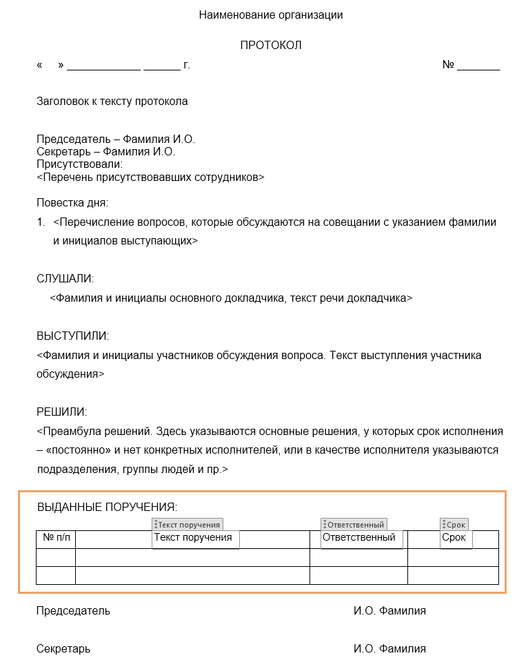 Если в организации разработаны свои шаблоны протоколов совещаний, доработайте их для автоматизированного создания поручений. Для этого воспользуйтесь одним из способов: