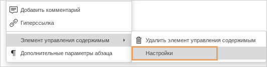 1.В содержимое шаблона добавьте таблицу. Для этого на ленте на вкладке Вставка в выпадающем списке Таблица выберите нужное количество столбцов и строк. Таблица должна содержать как минимум 3 столбца (для текста поручений, исполнителей и сроков). Количество строк может быть любым, при оформлении протокола секретарь совещания может добавить дополнительные строки: 2.В добавленной таблице укажите заголовки столбцов, которые увидят сотрудники при создании протокола из шаблона. ВАЖНО. Если сотрудники организации работают с документами в приложении LibreOffice, то данные для автоматического заполнения полей в карточках поручений определяются по названиям столбцов таблицы, а не по элементам управления содержимым. В этом случае назовите соответствующие столбцы таблицы Текст поручения, Ответственный и Срок. 3.Добавьте элементы управления содержимым в заголовки столбцов таблицы. Для этого выделите заголовок и на ленте на вкладке Вставка в выпадающем списке Элементы управления выберите пункт Форматированный текст: 4.Задайте свойства элементов управления содержимым в заголовках столбцов. Для этого в контекстном меню элемента в выпадающем списке Элемент управления содержимым, выберите пункт Настройки:
