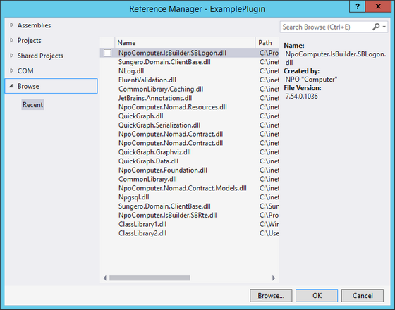 6.Созданный по умолчанию класс Class1 переименуйте именем создаваемого плагина, т.к. он будет отображаться в настройках сервиса NOMAD, и добавьте для него наследование от одного из интерфейсов плагинов. 7.Для разрешения типа используемого интерфейса, а также используемых в нем типов, подключите к проекту соответствующие сборки, например NpoComputer.Nomad.Contract и NpoComputer.Nomad.Contract.Models. Для этого: a)В контекстном меню узла References выберите пункт AddReference. b)В открывшемся окне перейдите на вкладку «Browse»: