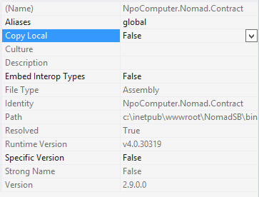c)Нажмите на кнопку Browse…. Откроется диалог выбора файлов. d)Выберите необходимую сборку из каталога bin установленного сервиса NOMAD. Каталог сервиса NOMAD может быть перенесен на текущий компьютер копированием с рабочего сервера или предварительно развернут на текущей компьютере. При успешной загрузке сборка будет отображаться в дереве проекта в узле References. 8.В контекстного меню сборки выберите пункт Properties. 9.В параметре Copy Local установите значение False:
