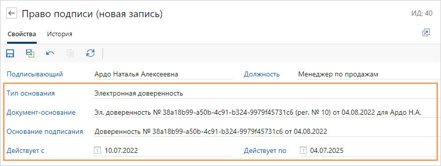 Для сотрудника можно создать право подписи документов из карточки доверенности или электронной доверенности. При этом доверенность должна быть в состоянии «Действующий» и с актуальным сроком.