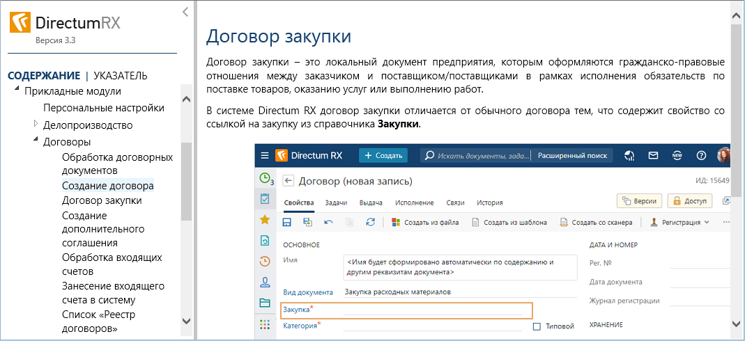 В справку WebHelp можно добавить собственные разделы. Допустим, на проекте внедрения в компании разработали тип документа «Договор закупки», которого нет в стандартной поставке Directum RX. Необходимо описать работу с новым типом документа и включить в справку. Для этого: