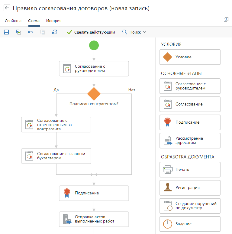 Предположим, что настраивается правило согласования актов выполненных работ. Необходимо добавить условие: если акт подготовлен и подписан контрагентом, значит в порядок согласования нужно включить ответственного за контрагента и главного бухгалтера.