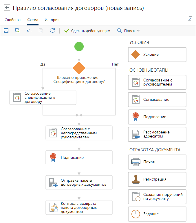 Предположим, что настраивается правило согласования договоров поставки. Необходимо добавить условие: если к договору приложена спецификация, то специалист финансового отдела получает задание на согласование спецификации.