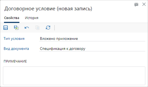 В выпадающем списке *Тип условия выберите значение Вложено приложение. Станет доступно для заполнения поле *Вид документа. Для выбора доступны все действующие виды документов. Выберите значение Спецификация к договору. В результате при отправке договора на согласование по регламенту проверяется, что в его карточке на закладке «Связи» в группе «Приложения» есть спецификация.