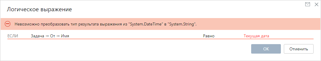 •при настройке блока «Условие» и левое, и правое выражение должны возвращать значение одного типа. Если тип не соответствует нужному, при сохранении выражения возникнет ошибка. В этом случае исправьте ее и повторно сохраните выражение.