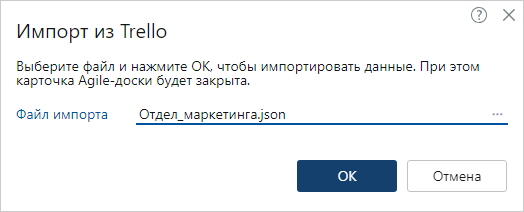 3.В карточке Agile-доски на панели действий нажмите на кнопку Импорт из Trello и выберите загруженный JSON-файл: