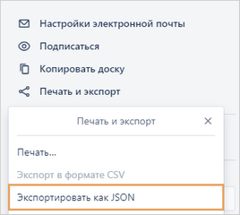 1.В Trello откройте меню доски и последовательно выберите пункты Еще…, Печать и экспорт и Экспортировать как JSON: