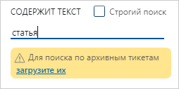 Отображает тикеты, в которых заголовок, описание или ИД содержат введенный текст. Длина текста для поиска – не менее 3 символов. Для поиска по точному совпадению установите флажок Строгий поиск. Если флажок снят, поиск выполняется по всем формам введенного слова. Для поиска по ИД введите перед ним символ #. Пример: #OM-154. В этом случае отображается только тикет с указанным ИД. ПРИМЕЧАНИЕ. По умолчанию тикеты, завершенные более недели назад, не отображаются, даже если содержат введенный текст. Чтобы загрузить их, нажмите на ссылку в подсказке: